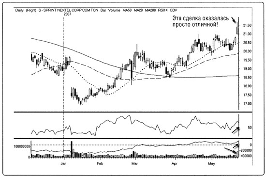 К концу дня котировки Sprint достигли максимума в $21,67, а затем к закрытию сессии слегка снизились до $21,40. Оборот составил почти 51 млн акций, что в два с половиной раза превышает средний дневной объем (18 млн акций). Изучите график на рис. 14.6 – свечу при закрытии торгов и пики на графике объема, говорящие о бычьем рынке.