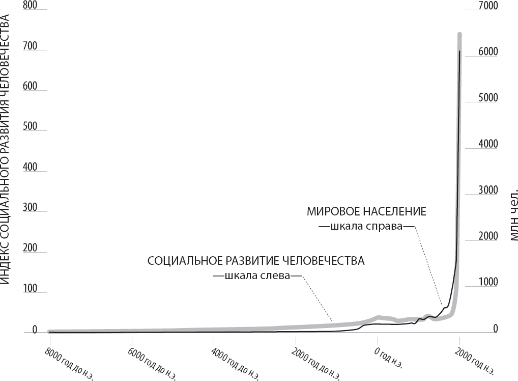 Ниже приведен график, в котором сопоставлены данные по населению планеты и соответствующим социальным достижениям; как вы можете видеть сами, эти две линии почти совпадают: