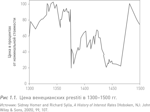 На рис. 1.1 показана динамика цен prestiti в течение двух веков – с 1300 по 1500 г. О чем говорит этот график? В течение первых 75 лет ситуация в Венеции оставалась относительно стабильной и цены prestiti были очень высокими – торговались практически по номиналу (100 % номинальной стоимости). В конце 1375 г. они продавались за 92,5 % номинала.