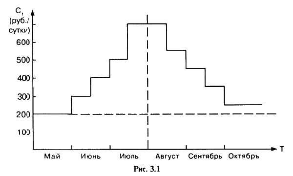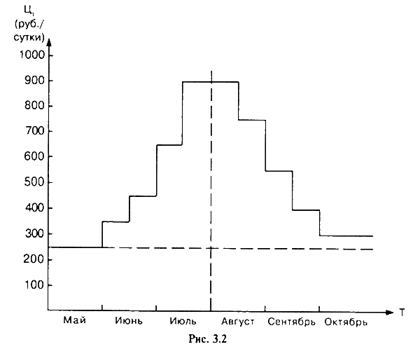 Себестоимость С1 для туроператора койко-места в двухместном номере конкретной частной гостиницы может колебаться, например, от 200 руб/сутки в мае до 700 руб/сутки в конце июля, начале августа. То есть себестоимость для туроператора услуги размещения меняется в 3,5 раза. Это стоимость койко-места, которую мы платим частной гостинице. Графически эта зависимость во времени выглядит так: