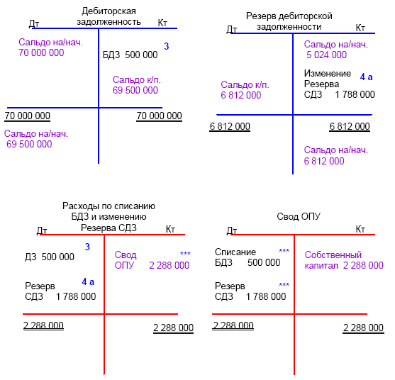 Дт «Списание БДЗ»(показатель ОПУ) Кт «ДЗ» (балансовый показатель) 500 000