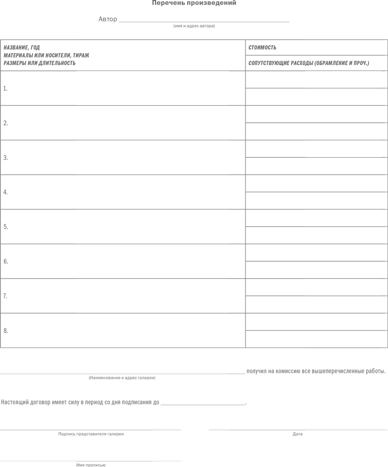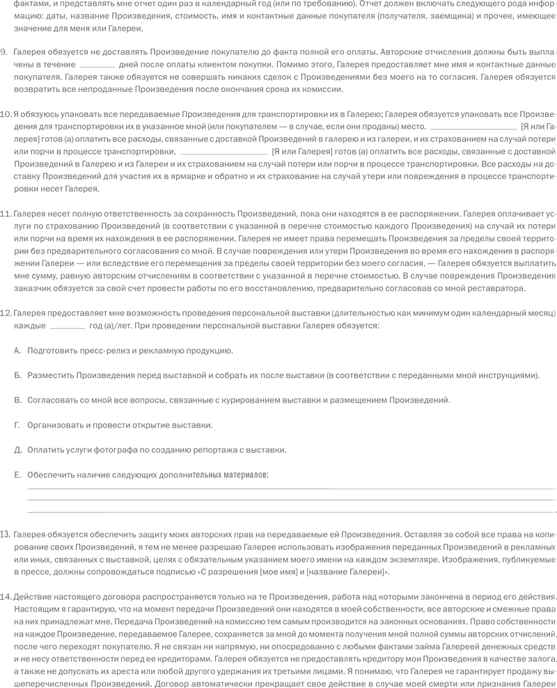 Как и в случае с образцами договоров комиссии или заказа, вы можете (и даже должны) исправлять его по своему усмотрению, добавляя, убирая или корректируя те или иные условия. Возможно, вы с галереей договоритесь о чем-то, о чем мы не упомянули. Или, наоборот, будет несколько обязательств, которые вы посчитаете излишними. Это всего лишь образец, а не готовая для заполнения форма. Он для того и составлялся, чтобы его меняли.