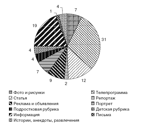 Так, на рис. 1.27 видно, что информация (короткий жанр) составляет 19 % контента газеты, а телепрограмма (семь полос) – 31 %. Причем судя по шрифту, телепрограмму можно точно ужать в 2 раза. Опять-таки создается впечатление о том, что целью является «заполнить объем».