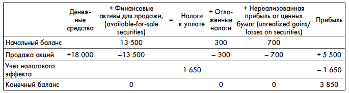 14 февраля 2008 г. АВС продала все имеющиеся у нее акции ССС по 36 руб. за акцию. В этом случае мы закрываем все счета и наконец-то признаем полученную прибыль в отчете о прибылях и убытках. Кроме того, расход по налогу на прибыль образуется только в этом случае и в полном размере (на всю полученную прибыль сразу):