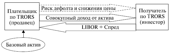 TRORS относят к синтетическим инструментам секьюритизации. Он отличается от обычного свопа активов, во-первых, потому что это внебалансовая сделка, т. е. инвестор не имеет на балансе базового актива (актив так и остается на балансе продавца свопа). Во-вторых, данным инструментом передается рыночный и кредитный риск. Другими словами, инвестор в случае дефолта эмитента по базовому активу выплачивает его стоимость продавцу (точнее, разницу между первоначальной и ликвидационной стоимостью). По окончании срока договора свопа инвестор также обязан выплатить разницу между первоначальной и рыночной стоимостью в случае снижения последней. Но в случае роста рыночной стоимости базового актива инвестор получает положительную разницу. Таким образом, продавец или плательщик по свопу хеджирует рыночный и кредитный риск, если он ожидает падение стоимости актива в перспективе, и при этом не может (или не хочет) продать базовый актив.
