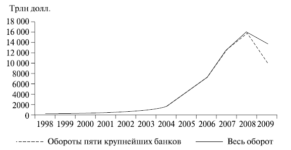 Аналогичные результаты демонстрируют данные по среднеквартальному обороту сделок банков США в период с 1998 по 2009 г. Информация взята из ежеквартальных отчетов компании ОСС (The Office of the Comptroller of the Currency’s Quarterly Report on Bank Trading and Derivatives Activities). Каждый отчет содержит данные о квартальном обороте сделок для общего числа и для первых пяти (в 1998 г. к ним относят первые 8, а с 1999 по 2004 г. первые 7) крупнейших по обороту деривативов банков США. В их число входят JP Morgan Chase Bank, Bank of America, Goldman Sachs Bank, Citibank National, Wells Fargo Bank.