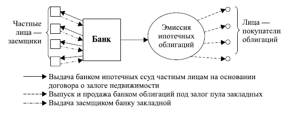 В последние годы банки стали объединять эти договоры в пулы закладных и под их обеспечение выпускать ипотечные облигации. Продав облигации, банк получает денежные средства, которые может направить на расширение своего бизнеса, выдавая новые кредиты. Ипотечные облигации считаются надежными ценными бумагами, так как они обеспечены хорошим залогом. Поэтому банк может по ним выплачивать невысокий процент. Для банка это, безусловно, выгодно, так как через продажу облигаций он получает более дешевые финансовые ресурсы. Однако при такой схеме все риски, которые сопровождают банковскую деятельность, переносятся на владельцев облигаций, так как закладные остаются на балансе банка.