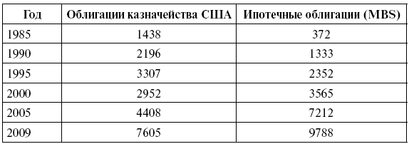 К настоящему времени рынок ипотечных облигаций США вырос до колоссальных размеров и по объемам превзошел рынок государственных облигаций. В табл. 1.2 представлены данные об объеме рынка облигаций казначейства США и ипотечных облигаций.