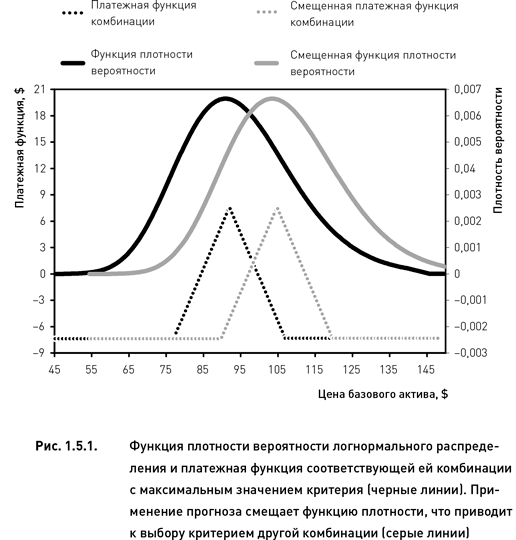 Внедрение прогноза в структуру стратегии методом корректировки распределения представлено на рис. 1.5.1. Черными линиями показаны функция плотности вероятности логнормального распределения и платежная функция комбинации «бабочка». Предположим, что данная комбинация имеет наибольшее значение критерия. Введение прогноза смещает функцию плотности (серая линия на рис. 1.5.1). В результате значение критерия б?лее не является максимальным для этой комбинации. Теперь уже другая комбинация (серая пунктирная линия), чья платежная функция более соответствует новому распределению, имеет максимальное значение критерия. Таким образом, использование прогноза путем видоизменения распределения приводит к выбору других комбинаций (по сравнению с теми, которые были бы выбраны без применения прогноза) при формировании опционного портфеля.
