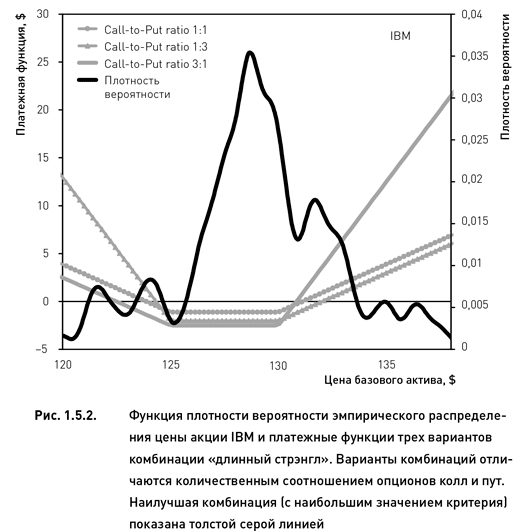 Рассмотрим несколько примеров. Ограничим количество рассматриваемых вариантов тремя: (1) количество коллов втрое превышает количество путов (соотношение Сall-to-Put равно 3); (2) равное соотношение коллов и путов (соотношение Call-to-Put равно 1), (3) количество коллов втрое меньше количества путов (соотношение Call-to-Put равно 0,33). Предположим, что для акции IBM необходимо выбрать наилучший вариант для комбинации «длинный стрэнгл». (Говоря «выбрать», мы подразумеваем генерирование сигнала на открытие торговой позиции.) На рис. 1.5.2 показана функция плотности вероятности эмпирического распределения и платежные функции трех вариантов длинного стрэнгла. Распределение было построено 1 апреля 2010 г. на основе 120-дневного исторического периода. Комбинации построены из опционов, истекающих 16 апреля 2010 г., используя страйки Put 125 и Call 130. В данном случае наибольшее значение критерия «математическое ожидание прибыли на основе эмпирического распределения» было получено для комбинации, в которой количество колов втрое превышает количество путов. Выбор именно этого варианта комбинации объясняется формой эмпирического распределения. В целом данное распределение имеет правое смещение (кроме того, имеется локальный пик в районе цены $132). Такая форма распределения прогнозирует рост цены базового актива. Следовательно, комбинация, в которой количество опционов колл превышает количество путов имеет больший потенциал прибыльности (в случае если прогноз окажется верным).