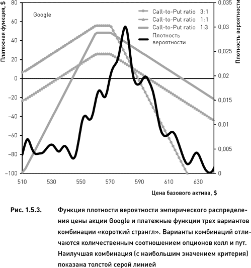 Во втором примере мы использовали другой базовый актив (акция Google), для которого необходимо выбрать наилучший вариант комбинации «короткий стрэнгл». Функция плотности вероятности эмпирического распределения и платежные функции трех вариантов короткого стрэнгла показаны на рис. 1.5.3. Так же как и в предыдущем примере, распределение было построено 1 апреля 2010 г. Комбинации также были созданы из опционов, истекающих 16 апреля 2010 г. (страйки Put 560 и Call 570). В данном случае, хотя форма эмпирического распределения отличается от распределения, полученного в предыдущем примере (сравни рис. 1.5.2 и 1.5.3), оно также смещено в правую сторону. Это означает, что прогноз, внедряемый в структуру частично направленной стратегии, указывает на высокую вероятность роста цены базового актива. В такой ситуации целесообразно продать больше опционов пут. Если прогноз действительно реализуется на практике, то цена акции вырастет, и убыток может быть понесен по проданному (в меньшем количестве) колу. Проданные же путы скорее всего истекут вне денег и принесут повышенную прибыль (поскольку были проданы в большем количестве). В полном соответствии с этими рассуждениями значение критерия оказалось наибольшим для комбинации, в которой количество колов втрое меньше количества путов.