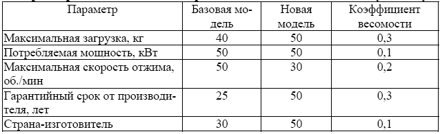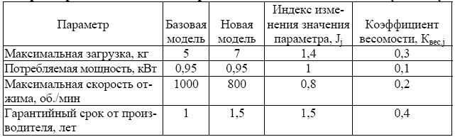 Пример. Определим цену новой стиральной машины, если цена ближайшего аналога составляет 17 000 руб. Характеристики новой и базовой моделей приведены ниже.