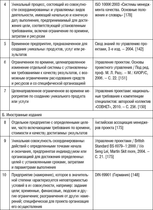 Приведенные в табл. 4.1 определения проекта используются в документах нормативного характера, имеющих статус международной или национальной системы требований в области управления проектами. Специалисты по управлению проектами пользуются тем из них, которое наиболее подходит к решаемой ими задаче с учетом уже сложившейся практики на их предприятии, а также требований заказчика.