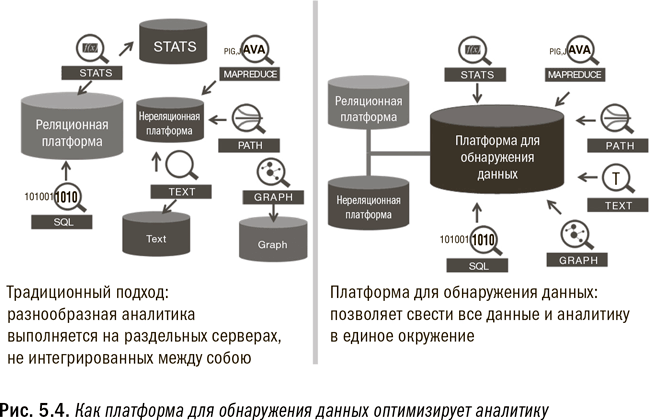 Сегодня платформы для обнаружения данных, которые являются второй опорой единого аналитического окружения, позволяют смешивание и сопоставление всех типов данных, как структурированных, так и нет. Такая платформа должна поддерживать и реляционную, и нереляционную обработку. Она также должна поддерживать практически любой вид аналитической методологии или подхода. Это означает, что она должна поддерживать не только традиционные методы статистики и прогнозирования, но и текстовый анализ (имейлов, документов и т. д.), анализ объектных графов (взаимных связей между людьми, местностями или объектами), геопространственный анализ (пространственных отношений) и многое другое. На рис. 5.4 проиллюстрировано, как платформа для обнаружения данных комбинирует и упрощает обработку аналитики.