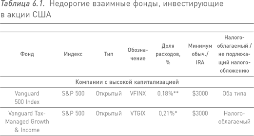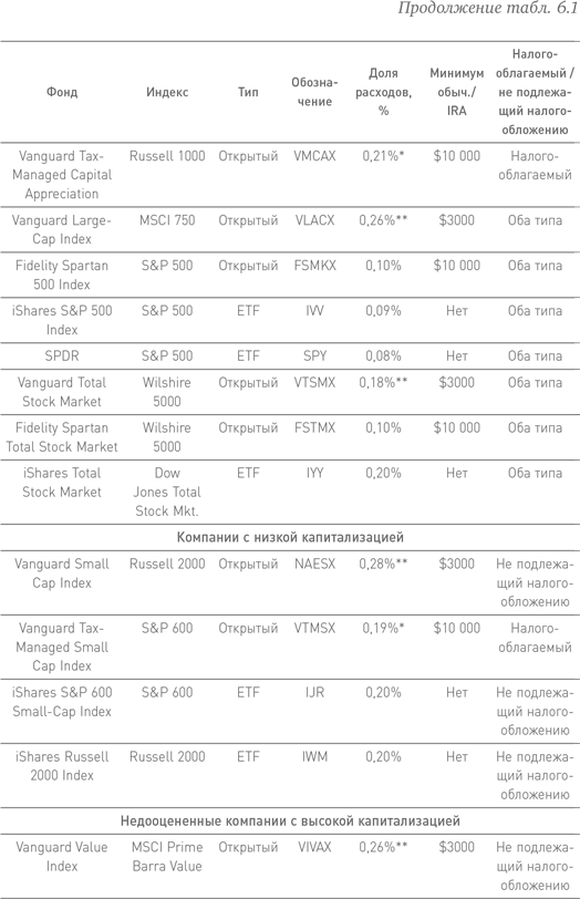 В таблицах 6.1, 6.2 и 6.3 сведены воедино мои рекомендации по распределению активов применительно к акциям США, зарубежным акциям и облигационным взаимным фондам. Для каждого класса активов я привожу перечень традиционных фондов открытого типа, которые можно покупать или продавать только раз в день по рыночной цене на момент закрытия биржи в 4 часа пополудни по североамериканскому восточному времени.