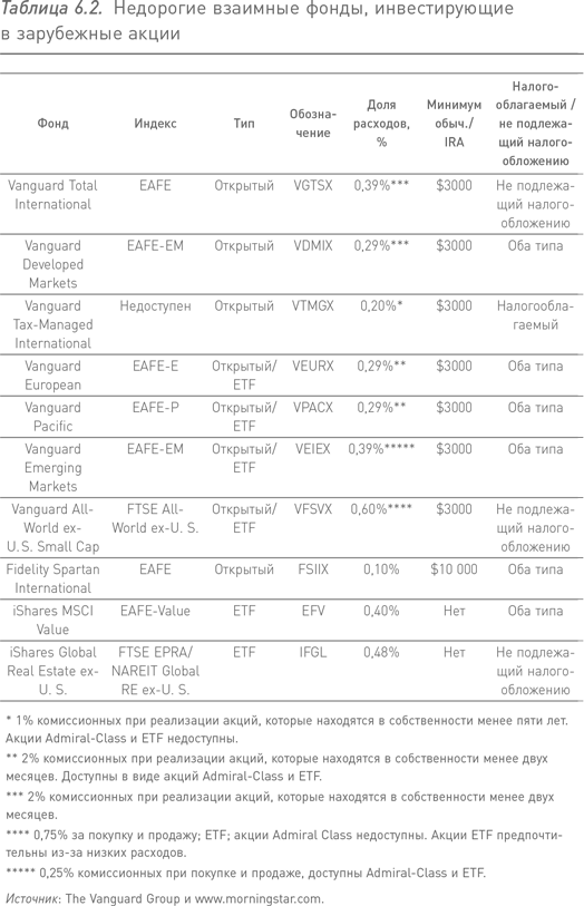 И все-таки я полагаю, что в ряде случаев приобретение ETF имеет смысл. Первый из них – это ETF iShares EAFE в категории недооцененных компаний, поскольку среди предложений Vanguard нет аналогичного индексного/пассивно управляемого взаимного фонда. Второй случай – это Vanguard All-World ex-U. S. Small-Cap ETF, фонд, который не взимает 0,75 % комиссионных, подлежащих уплате при операциях с акциями Investor-Class, и имеет значительно более низкую долю расходов (0,38 % вместо 0,60 %). Третий – это фонд зарубежных инвестиционных трастов недвижимости iShares (IFGL), для которого нет эквивалентного открытого фонда, доступного большинству мелких инвесторов.