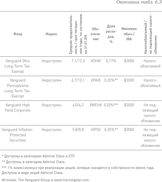 Предложения в категории ETF перечислены в примечаниях после таблиц. В сущности, такие фонды аналогичны взаимным, за исключением того, что они торгуются на фондовой бирже и могут покупаться и продаваться в часы работы рынка. При этом процедура эмиссии и выкупа их акций такова, что позволяет уменьшить налоги по сравнению с традиционными фондами открытого типа. Эти преимущества обходятся недешево, поскольку, торгуя ими, вам придется уплачивать комиссионные и спреды бид-аск.