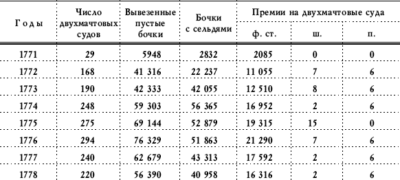 судов для лова сельдей, снаряженных в Шотландии в течение одиннадцати лет, числа взятых пустых бочек и бочек, заполненных сельдями: средняя премия за каждую бочку сельдей морской заготовки и за каждую наполненную бочку