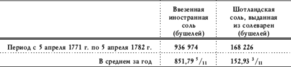 количества иностранной соли, ввезенной в Шотландию, и шотландской соли, выданной беспошлинно из солеварен для рыбной ловли с 5 апреля 1771 г. по 6 апреля 1782 г., и среднее количество той и другой в год