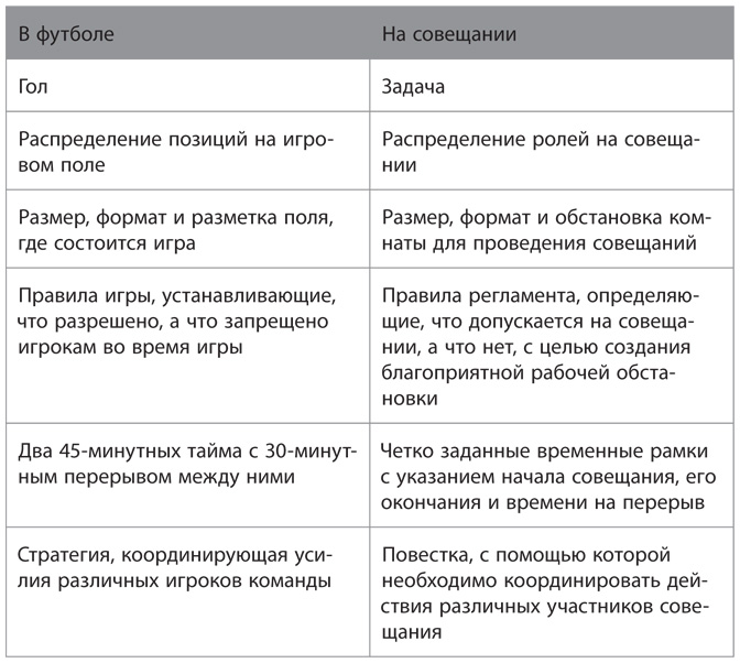 В футболе четко установлены правила игры. Мы знаем, что никому, кроме вратаря, нельзя действовать руками. Мы знаем, что такое фол, офсайд и пр. Подобные типовые правила необходимы и для ведения совещаний. Нужны четкие правила регламента для того, чтобы мы могли создать желаемую рабочую атмосферу. И если правила игры в футбол остаются неизменными в любом уголке мира, регламент совещаний требует внесения изменений в правила различных организаций с тем, чтобы лучше вписаться в конкретные культуры, в контексте которых они функционируют.