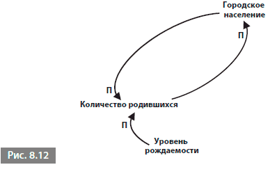 В действительности это все-таки связь типа П, и это еще один пример вроде того, что мы уже рассматривали, где одна из связей в диаграмме цикличной причинности (см. рис. 4.7) работает только в одном направлении. Это был пример с наливанием кофе в чашку, и односторонность связи объяснялась тем, что наливание кофе может вести только к одному результату: наполнению чашки. Здесь объяснение такое же: количество родившихся может только увеличивать городское население.