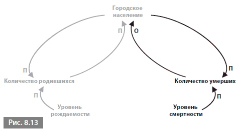 На рис. 8.13 показана усиливающая петля, движущая ростом городского населения с помощью количества родившихся. Она взаимосвязана с уравновешивающей петлей, сокращающей городское население с помощью количества умерших.