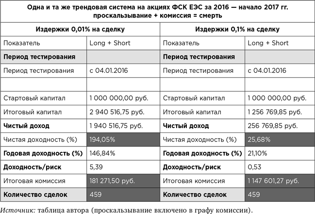 Комиссию видно сразу, но дьявол глубже. Проскальзывание. Если за стратегией идет капитал в миллионы рублей, оно неизбежно. Допустим, оно 0,1 % от сделки. Стратегия на третьем плече. Позиции держатся в среднем неделю. Итого 0,1 % ? 2 (вход и выход) ? 3 (плечо) ? 50 (округленно недель в году) = 30 % годовых. Этих денег даже никто не присвоил. Комиссию снял дьявол, сидящий в автоследовании по определению. И это еще умеренный дьявол, с понятием. Представьте, сколько вы переплатили бы на интрадейной торговле.