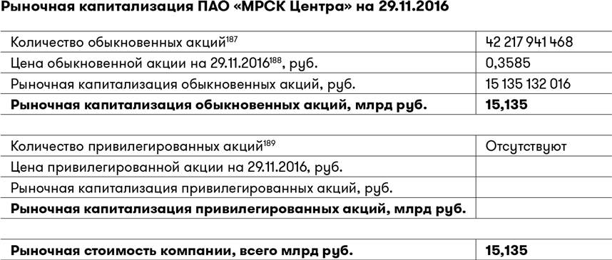 Даже не вникая во все детали финансовой отчетности, можно сказать, что компания работает успешно и справляется со своими обязательствами и текущими расходами. И у нее еще остаются деньги в виде чистой прибыли. ПАО «МРСК Центра», будучи компанией с финансово благополучным положением, может представлять интерес для инвесторов. Выясним, насколько привлекательна цена ее акций. Для этого надо узнать рыночную стоимость компании.