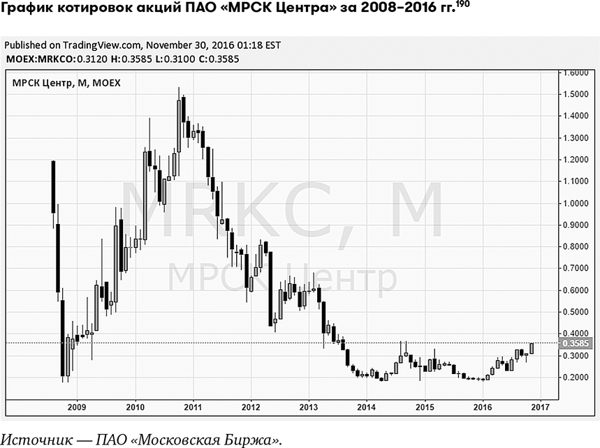 На графике видно, что акции ПАО «МРСК Центра» были дорогими в первой половине 2008 г., до мирового финансового кризиса. В это время одна акция стоила больше 1 руб. После кризиса акции за несколько лет восстановились в цене и в конце 2010-го – начале 2011 г. стоили около 1,3–1,5 руб. С 2011 г. они почти постоянно дешевели и к 2014 г. стали стоить около 0,2 руб. В период с 2014-го по конец 2016 г. акции торговались в диапазоне от 0,18 до 0,36 руб. Акции ПАО «МРСК Центра» по цене 0, 3585 руб. за штуку, на мой взгляд, являются дешевыми.
