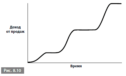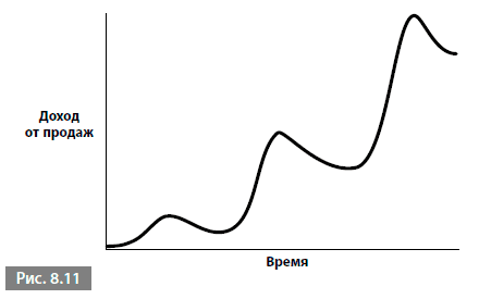 В этом примере периоды роста прерываются периодами, когда в действие вступают ограничители. К счастью, этой компании удается поддерживать между периодами роста стабильность. Большинство движется более резкими скачками, как на рис. 8.11.