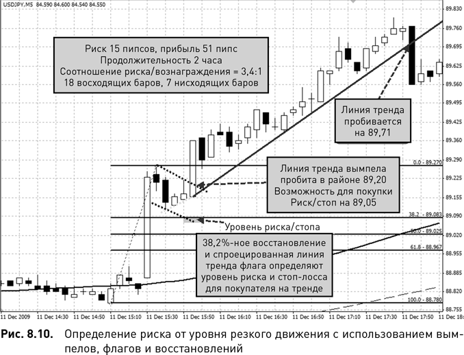 На рис. 8.10 показаны восстановление Фибоначчи и параллельная линия тренда флага. Эти линии в своей совокупности делают область риска для трейдеров более гибкой. Когда рынок движется быстро, как в нашем примере, повышенная рыночная волатильность может требовать для маневра больше места, чем дает формация вымпела. Именно поэтому вымпелы возникают значительно реже, чем флаги. Рынок слишком возбужден движением, но ему требуется некоторое пространство для маневра, даже во время коррекций.