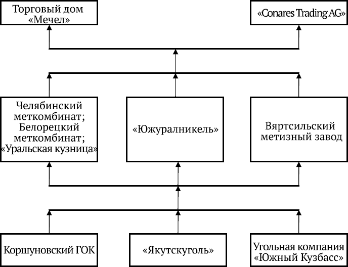 Вертикальная интеграция представлена на примере ОАО «Стальная группа Мечел», которая включает полный цикл производства и реализации металлургической продукции: метизов, труб, поковок, штамповок, металлопроката, стали, никеля, угля, железорудного концентрата (рис. 24).