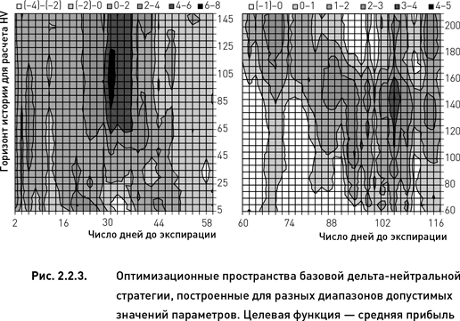 Кроме того, диапазон допустимых значений не должен обязательно начинаться с наименьших возможных значений параметра, как это было сделано в предыдущих примерах (рис. 2.2.2 и 2.2.3, левый график). Допустим, что разработчик создает стратегию, работающую с более долгосрочными опционами. В этом случае он может задать нижнюю границу на диапазон допустимых значений параметра «число дней до экспирации». Допустим – это будет 60 дней (пусть верхняя граница остается без изменений). Изменение в диапазоне этого параметра потребует внесения изменений и в диапазон второго параметра, поскольку при торговле долгосрочными опционами неразумно оценивать их с помощью критерия, рассчитываемого на основании волатильности, оцененной на более коротком периоде, чем период обращения самих опционов. Следовательно, диапазон значений параметра «период истории для расчета HV» должен быть также ограничен снизу 60 днями (для того чтобы количество значений каждого параметра в пределах допустимого диапазона было одинаковым, верхнюю границу ограничим значением 210).