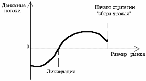 «Сбор урожая» включает контролируемое изъятие инвестиций для оптимизации денежных потоков компании при выходе компании из данной отрасли. Для увеличения внутренних денежных потоков управление фирмой устраняет или ограничивает новые инвестиции, ограничивает затраты на эксплуатацию, снижет расходы на продвижение и НИОКР, расходует прибыли прошлых удачных периодов. Эффект иллюстрирован рис. 17.