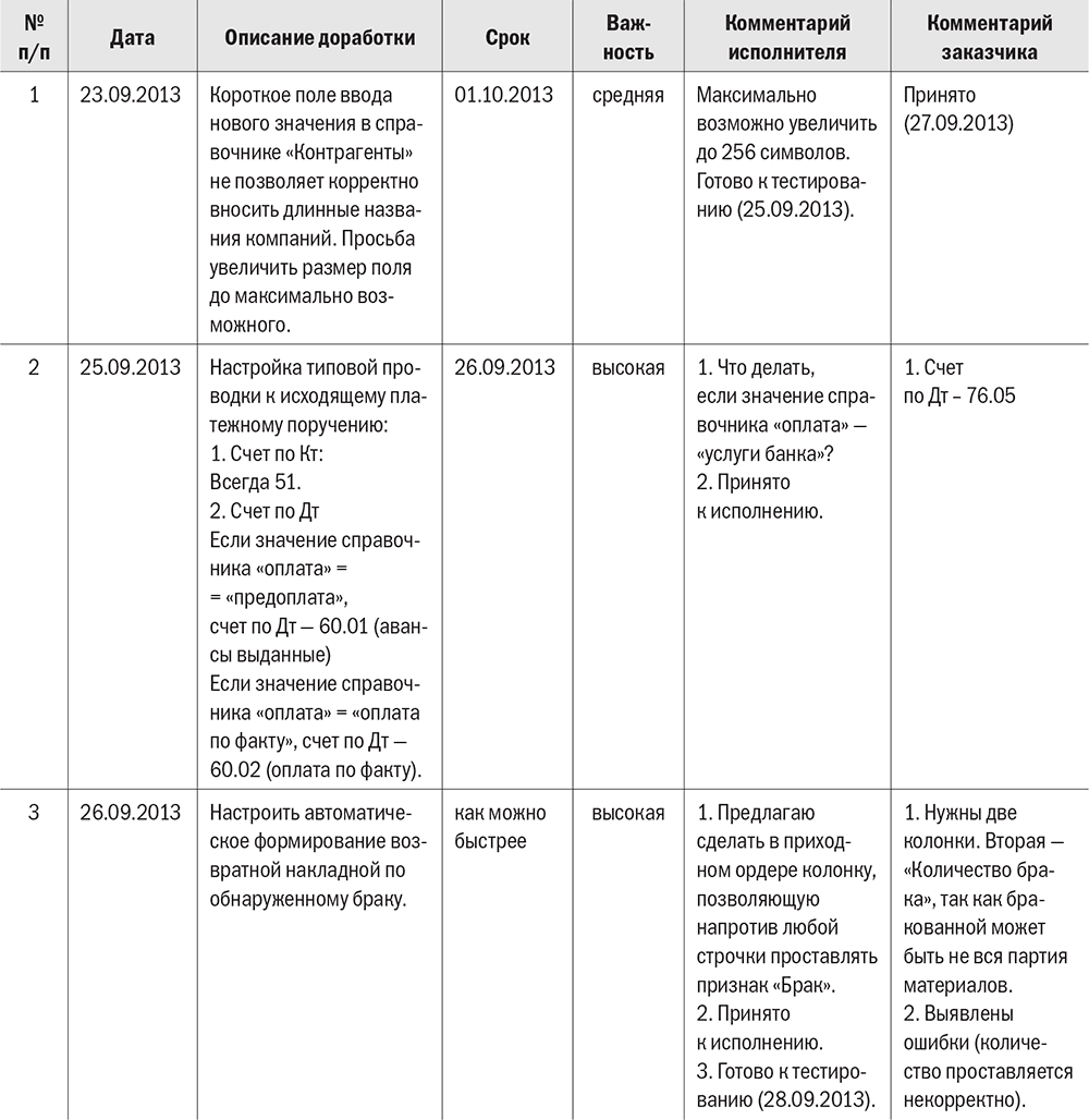 Таблица 8.2. Реестр запросов на доработку бухгалтерской программы