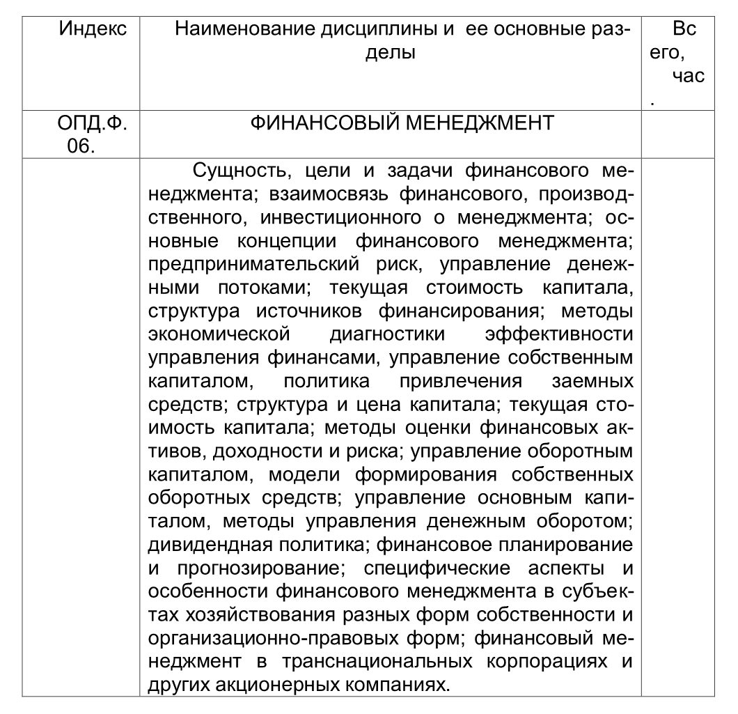 Требования к обязательному минимуму содержания основной образовательной программы экономиста-менеджера по специальной дисциплине – ОПД.Ф.06 Финансовый менеджмент, – к условиям ее реализации и срокам ее освоения определяются государственным образовательным стандартом (ГОС ВПО).