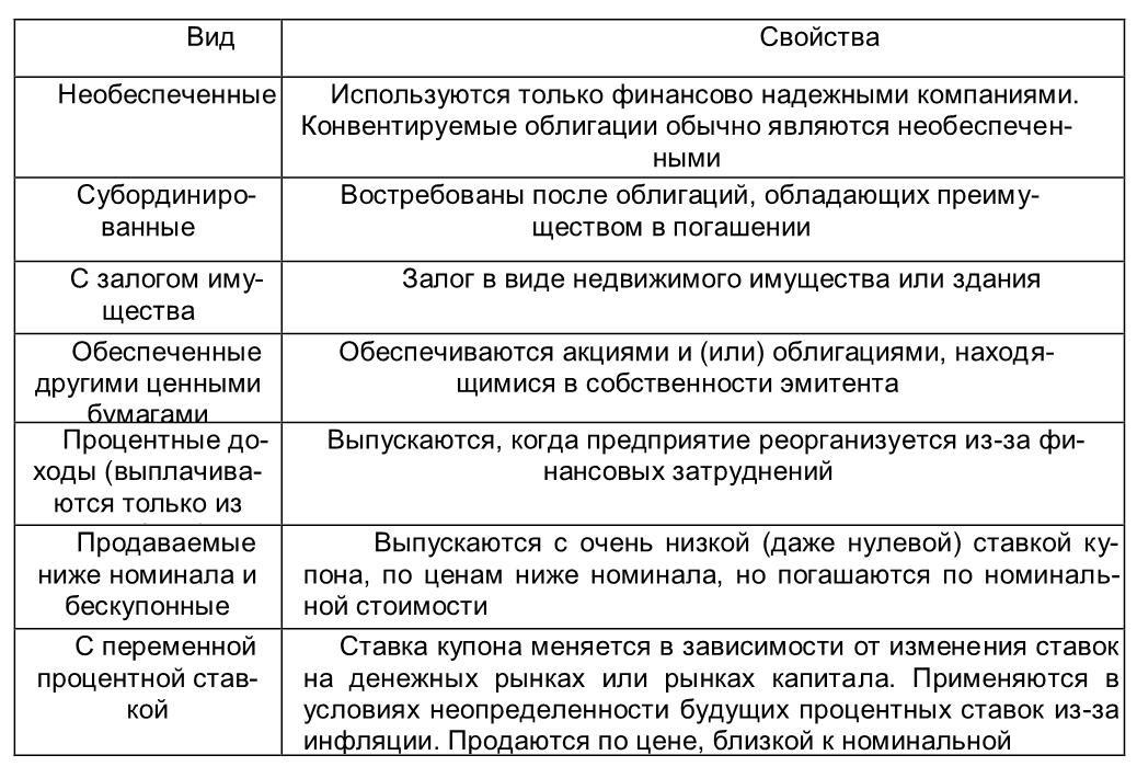 Предприятия могут выпускать различные виды облигаций: необеспеченные, с залогом имущества, конвертируемые, гарантированные, бескупонные, с переменной процентной ставкой, еврооблигации и др. (таблица 7.2).