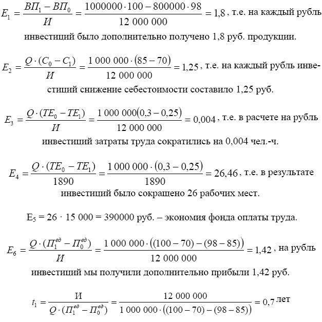 Пример. Предприятие в прошлом году производило 800 тыс. шт. изделий себестоимостью 85 руб. и ценой реализации 98 руб. В этом году в производство было инвестировано 12 млн. руб. В результате было произведено всего 1 млн. шт. изделий, себестоимость составила 70 руб. за изделие, цена – 100 руб. Годовой фонд рабочего времени не изменился и составил 1890 чел.-ч. Трудоемкость до инвестиций составляла 0,3 чел.-ч., после -0,25 чел.-ч. Средняя зарплата рабочего с начислениями составила 15000 руб. Оцените эффективность инвестиций (капитальных вложений).