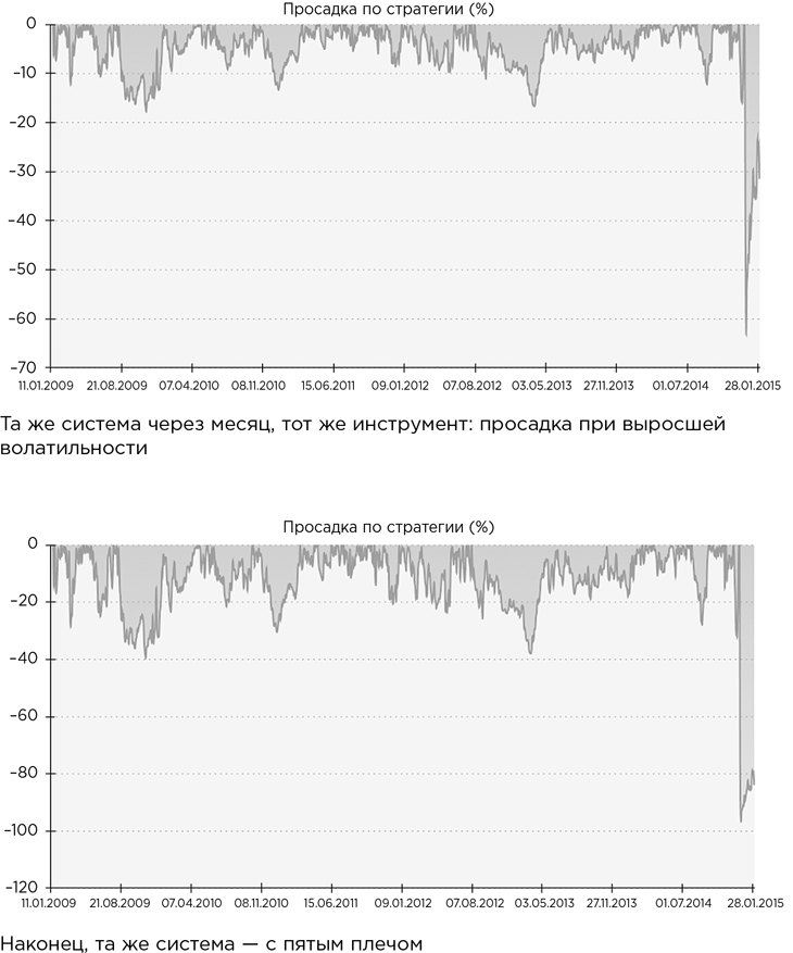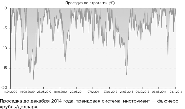 Далее уже не психологическое. Допустим, с аттракциона никто не спрыгнет при –50 %. Они поступят правильно, но, возможно, лучше бы спрыгнули. Иногда (для нормальной системы нескоро, но все равно) просадка — это не просадка, а конец. Для простейших трендовых систем по фьючерсу РТС и российским акциям, исправно работавших все нулевые годы, такой конец наступил в 2011–2012 годах. Дело даже не в том, конец это или не конец, но если система (именно спекулятивная, не инвестиционная) без прибыли более пары лет, лучше считать ее умершей, чем уснувшей. Это значит окончательное принятие убытка, а не временное. Но раз уж мы не можем контролировать сверхприбыль лучшего сценария, то контролируем хотя бы сверхубыток худшего.
