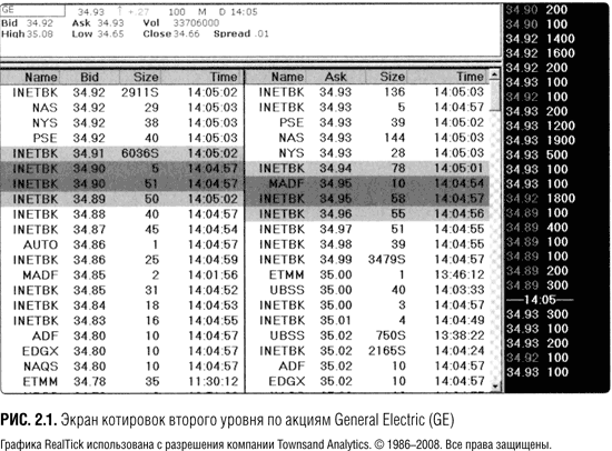 Экраны котировок второго уровня позволяют нам заглянуть «внутрь рынка» NYSE, Amex и NASDAQ, поэтому часто говорят, что они делают акции «прозрачными». Благодаря им мы видим заявки на покупку и продажу акций в очереди на исполнение. Кроме того, когда вы размещаете заявку непосредственно через систему котировок второго уровня, она минует всех посредников и попадает непосредственно на нужную биржу.