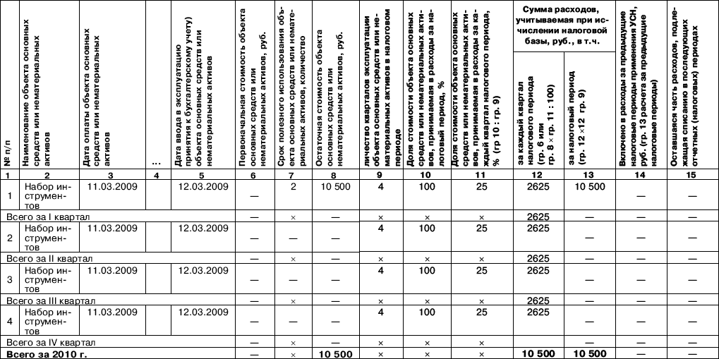 Так как срок службы инструмента не превышает трех лет, его остаточная стоимость включается в состав расходов в течение одного года. Ежеквартально необходимо включать в расходы 2625 руб. (10 500 руб. : 4).