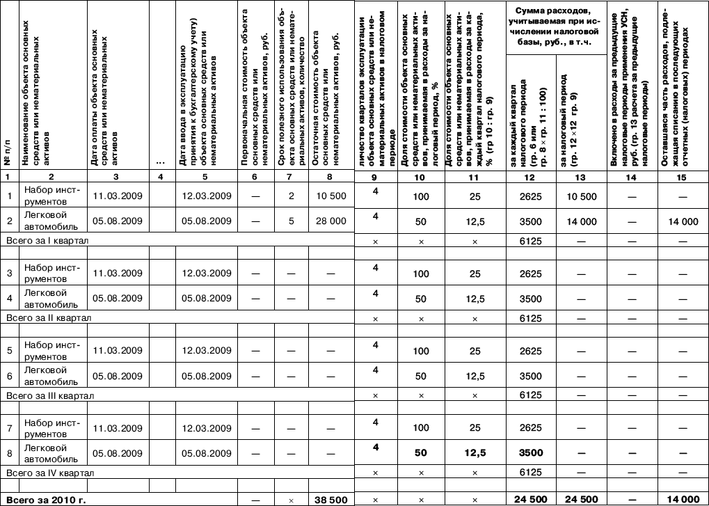 Запись в книгу учета доходов и расходов бухгалтер ООО «Правда» должен сделать 31 марта, 30 июня, 30 сентября и 31 декабря 2010 г. В бухгалтерском учете ООО «Правда» будет начислять амортизацию по автомобилю в прежнем порядке – по 500 руб. в месяц по август 2014 г. включительно.