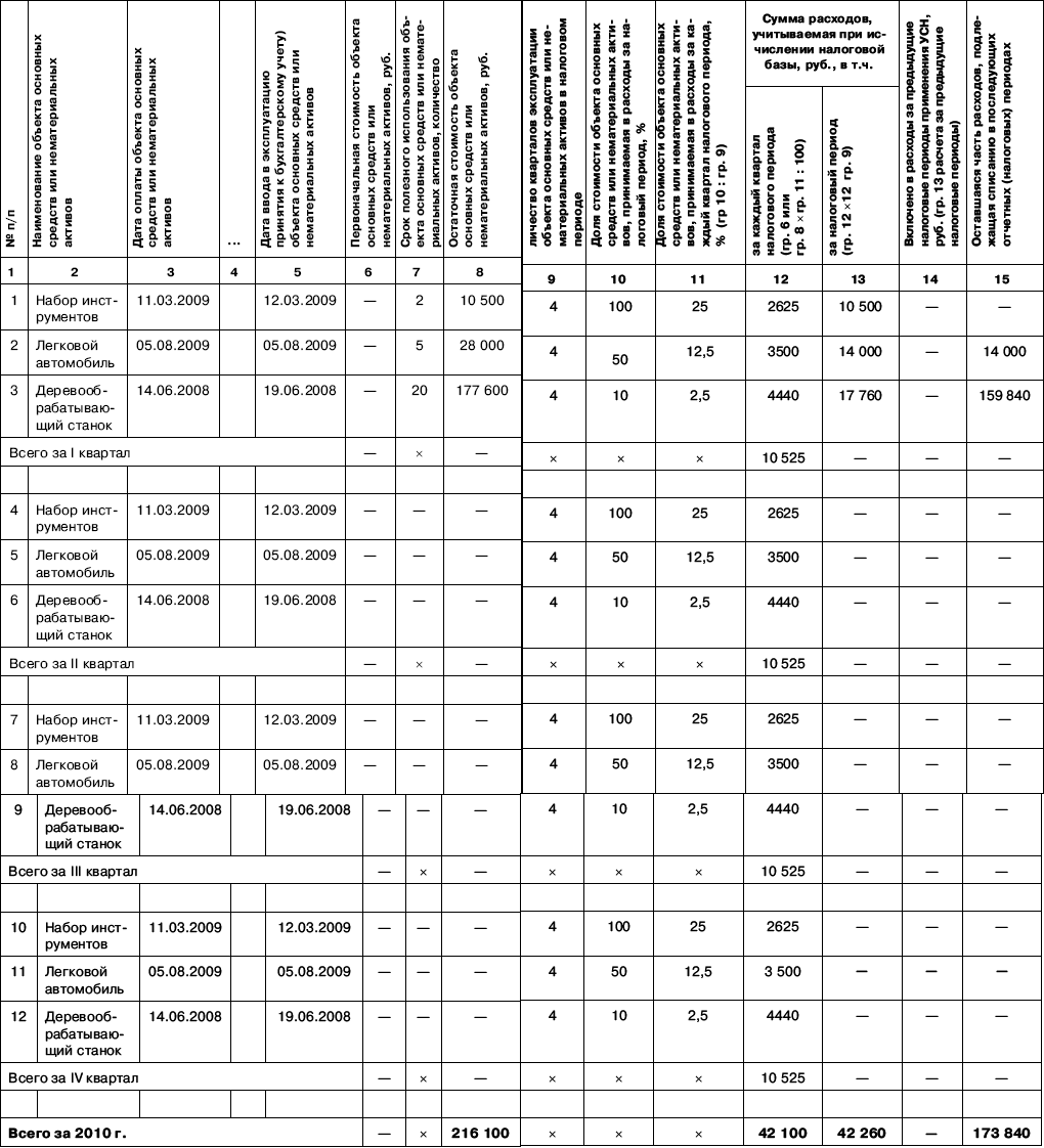 Так как срок службы станка превышает 15 лет, его остаточная стоимость включается в состав расходов в течение 10 лет. Ежеквартально в расходы необходимо включать 4440 руб. (177 600 руб. : 10 лет : 4).