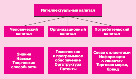 Индивидуальная компетенция – это способность сотрудников действовать в разнообразных ситуациях, их образование, квалификация, умения и навыки, опыт, энергия, отношение к работе, клиентам, уровень общей культуры. Внутренняя структура – это проекты, патенты, ноу-хау, авторские права, компьютерные и административные системы, системы сетевого взаимодействия, организационная структура, культура организации. Внешняя структура – это отношения с потребителями, поставщиками, конкурентами, местными сообществами, бренды, торговые марки, имидж организации.