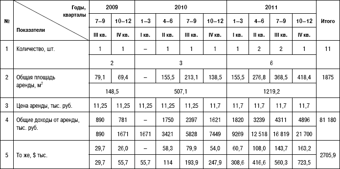 С августа 2010 г. начался процесс сдачи помещений в аренду. К концу 2011 г. компанией были успешно подписаны контракты на 11 коммерческих помещений. Четыре из них находятся в шестом корпусе; три – в пятом корпусе; три – в четвертом корпусе, рядом с которым расположен детский сад; и еще одно – в третьем корпусе. Всего в аренду компания сдала помещения общей площадью 1874,9 м2. Цена аренды с 11,25 тыс. руб./м2 повысилась до 11,7 тыс. руб./м2 в месяц. По нашим расчетам, за аренду каждого квадратного метра компания получает доход 1,5 тыс. руб. в год. Расчет доходов от сдачи в аренду по годам приведены в табл. 8.4.