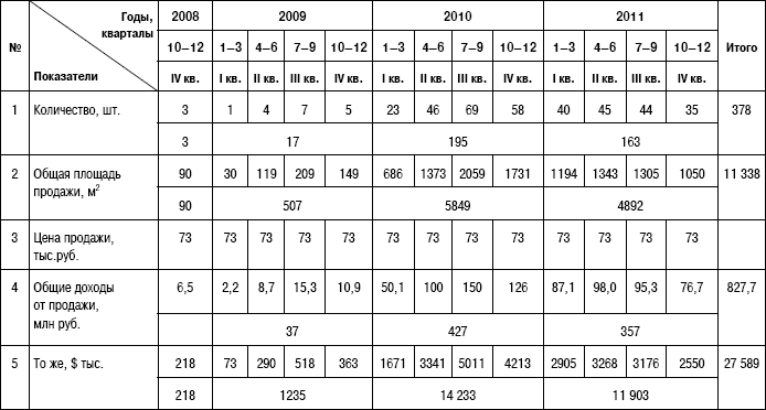 В 2008 г. (IV кв.) было продано 2828 м2 (3,39 % общей площади квартир) по продажной цене 69,50 тыс. руб./м2.