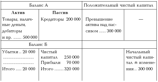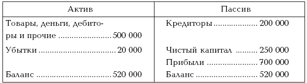 Таким образом, запись чистого капитала, долгов и прибылей на одной стороне, а убытков и активов на другой стороне баланса является результатом совершенно правомерных алгебраических действий слияния в единый баланс двух балансов, совершенно различных по своей природе.