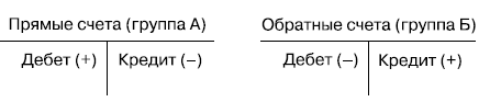 С точки зрения правил счетной регистрации все счета распадаются на две группы: группа А, или группа прямых счетов, и группа Б, или группа обратных счетов. Данные группы счетов конструируются по следующим схемам (рис. 4.4).