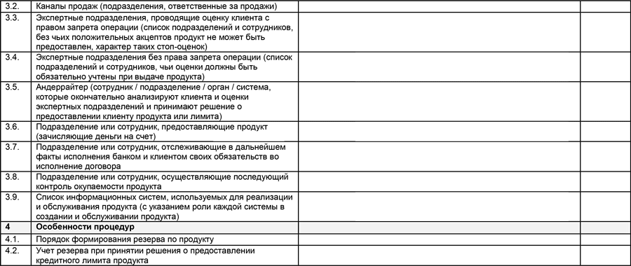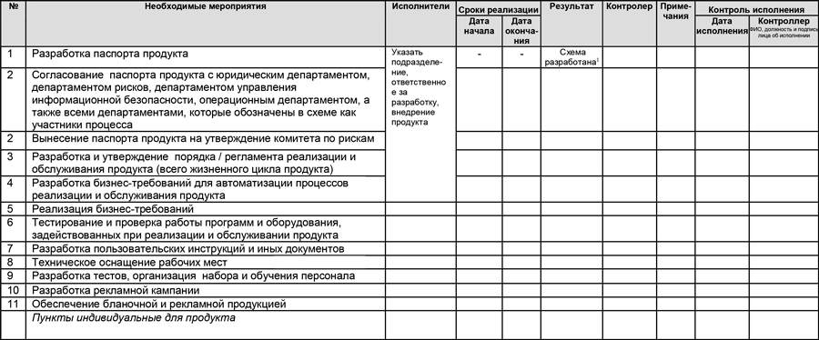 Паспорт продукта должен быть составлен подразделением, ответственным за разработку и внедрение продукта, и согласован с юридическим подразделением, подразделением рисков, подразделением информационной безопасности, подразделениями Бэк и Мидл, ИТ-подразделением, а также всеми подразделениями, которые обозначены в схеме как участники процесса. Замечания, которые не могут быть устранены, рассматриваются комитетом по рискам. Паспорт конкретного продукта утверждается комитетом по рискам.