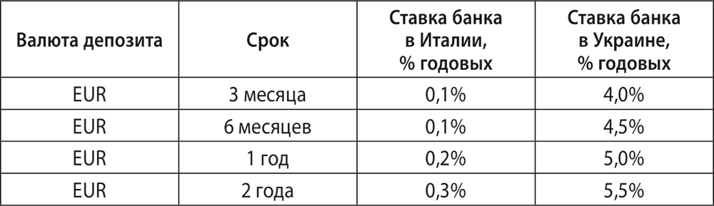 Давайте сравним условия по депозитам в одном и том же банке UniCredit. В одном случае, ставки, предлагаемые в Италии, в другом – ставки в Украине.